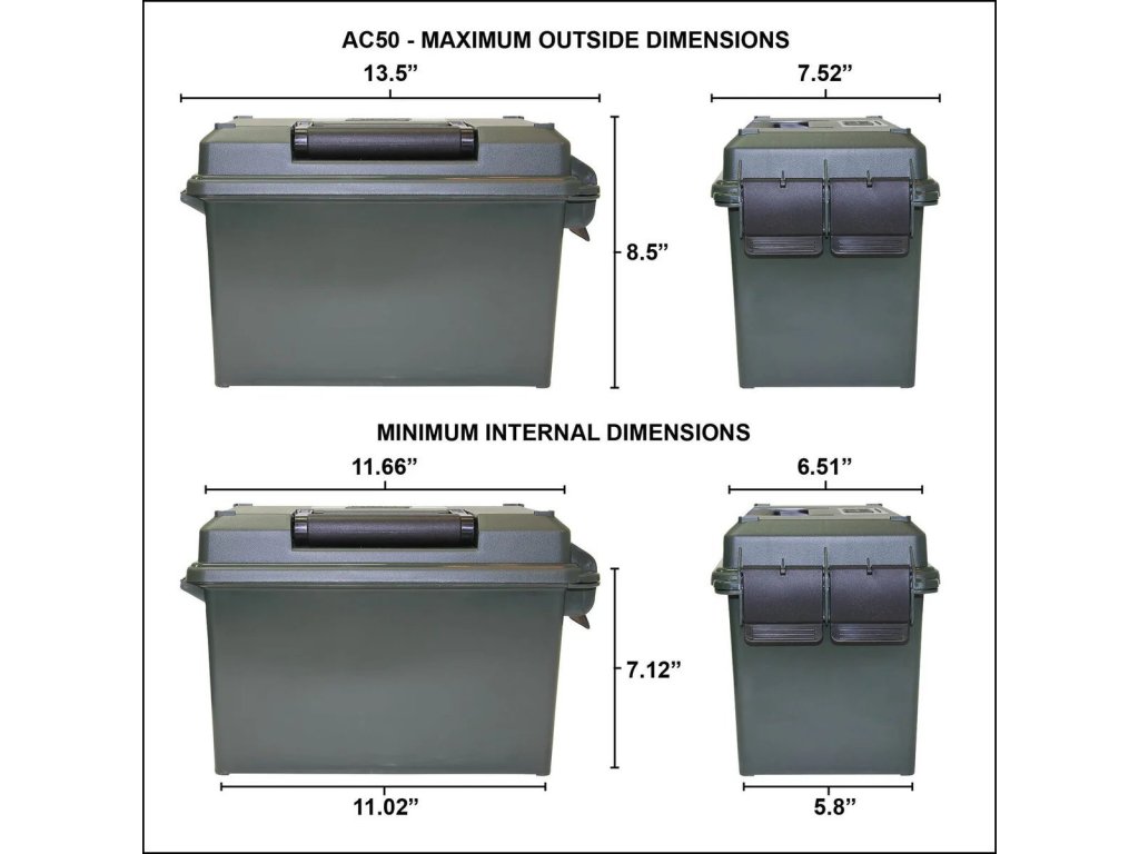 Krabice na munici MTM jsou skvělým způsobem skladování volně ložené nebo krabicové munice. Její celoplastové provedení je lehčí než schránka na munici ráže 50 US Military Surplus. Přenášení munice na střelnici a ze střelnice se právě stalo o něco jednodušší! Ideální pro skladování munice. Tyto plechovky na munici, které jsou vylisovány z odolného polypropylenového plastu, s pohodlnou manipulací vydrží i pěkně tvrdé zacházení. Díky využití těsnicího systému O-Ring s perem a drážkou od společnosti MTM, který zajišťuje vynikající voděodolnost, je plechovka ráže 50 mm navržena tak, aby se do ní vešlo stejné množství volně ložené munice jako do originálu. Odolný systém dvojitých západek zajišťuje lepší těsnění a menší pravděpodobnost náhodného otevření. Dvojité západky visacího zámku spolu s tvarovanými stohovacími hřebeny dělají z těchto pevných kontejnerů dokonalé řešení pro tolik potřebných skladů. Vnitřní rozměr: 5,8„ (D) x 11,0“ (Š) x 7,2“ (V) Vnější rozměr: 7,4„ (d) x 13,5“ (š) x 8,5“Doplňkové parametry