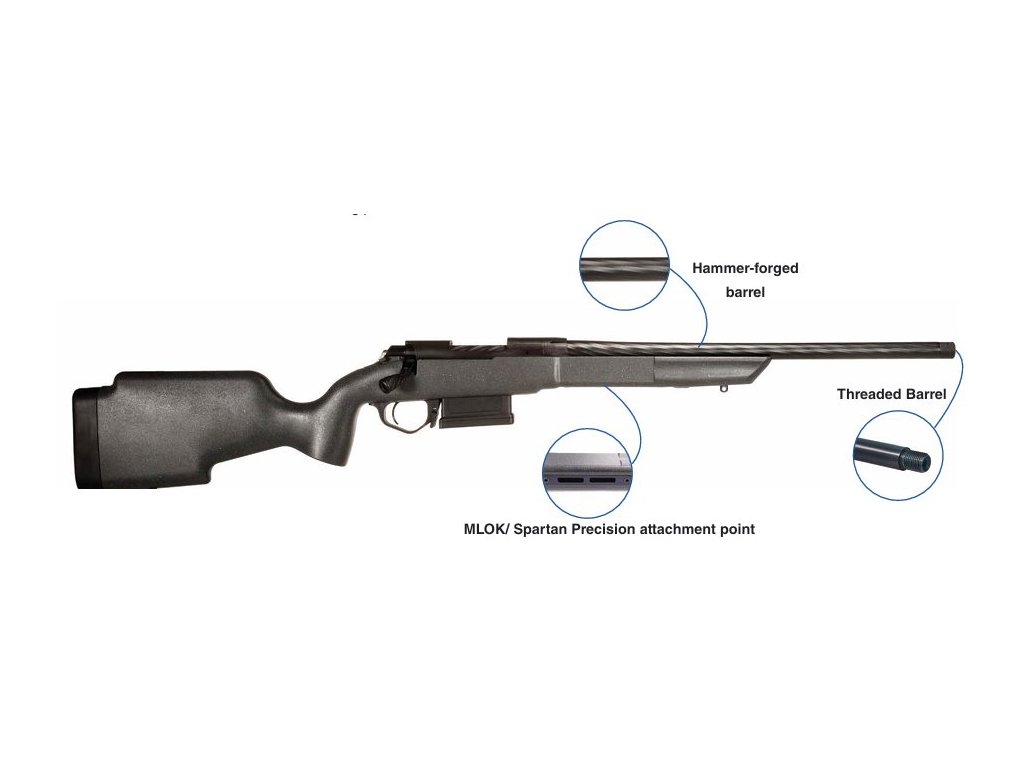 - Spartan Precision attachment point: integrované upínací místo pro specializované příslušenství.