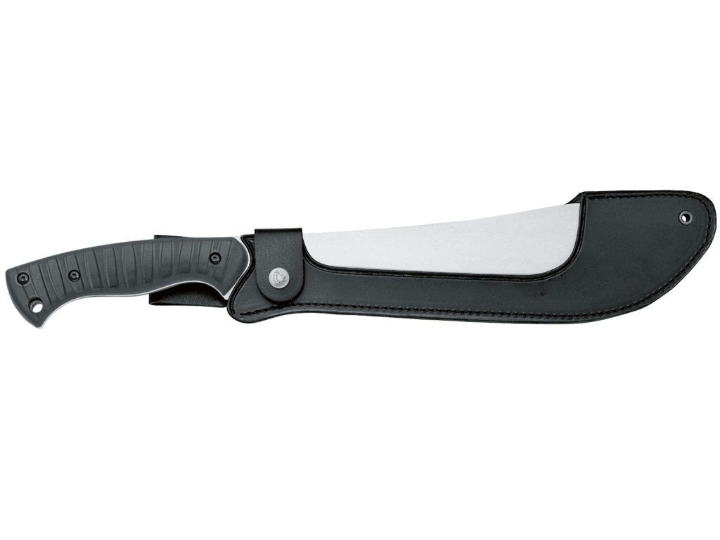Rukojeť z černého FRN® (vyztužený nylon) zajišťuje pevný a jistý úchop i v mokrých nebo prašných podmínkách. Odolává náročnému používání a nepříznivým vlivům počasí. Mačeta je dodávána s kvalitním koženým pouzdrem, které chrání čepel a umožňuje pohodlné nošení.