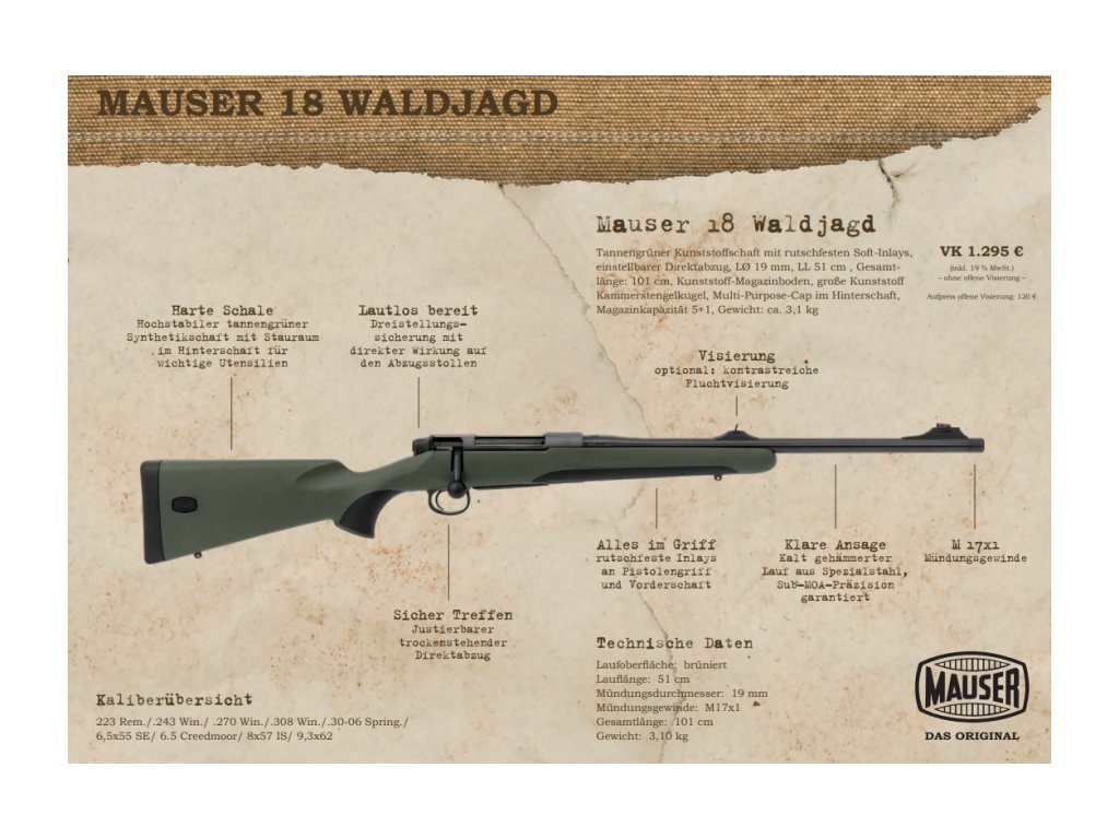 Nový Mauser M18 WaldJagd koncentruje lov do své elementární podoby: čisté řemeslné zpracování bez ozdob. Není to pouze lovecká puška, ale něco, co značka Mauser vždy symbolizovala: ultimátní zbraň pro všechny použitelná za všech okolností. Mauser M18 je více než jen další kus zbraně - je to ucelený balíček: Snoubí dohromady všechny základy pro lov ve své nejdokonalejší podobě a nezahrnujě nic, co není nezbytné v terénu. Výsledek je ryzí nástroj pro opravdové lovce se senzačním poměrem cena - kvalita. Jinými slovy: Mauser Vám přináší "Lidovou pušku".