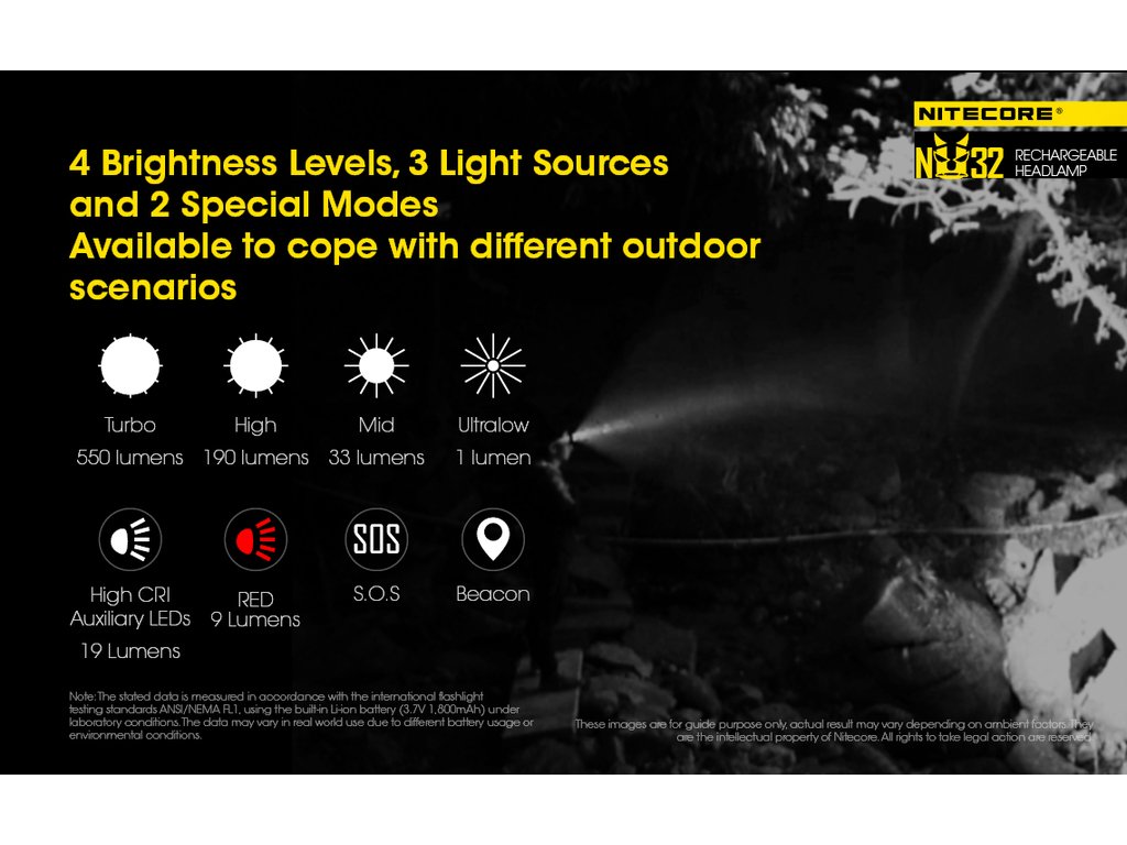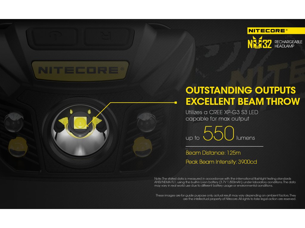 Nitecore NU32 je malá kompaktní a vysoce výkonná čelovka, která jako zdroj světla používa LED CREE XP-G3 S3 se světelným výkonem 550 lm a dosvitem 125 m. K napájení slouží integrovaný Li-Ion akumulátor. Elektronika čelovky umožňuje uživateli volit mezi třemi základními úrovněmi světelného výkonu a třemi dalšími režimy-svícení červených LED diod, blikání červených LED diod a lehký přísvit bílými diodami. Multifunkčnost čelovky zvyšuje možnost vyjmout čelovku z hlavového popruhu a používat ji jako malou kapesní svítilnu. Má široký světelný kužel 100° pro dokonalé periférní osvětlení prostoru a náklon svítilny v úhlu 60°. Nitecore NU32 je ideální čelovka nejen pro různorodé sportovní a outdoorové aktivity, jeskyňáře, výlety do přírody, ale taky do práce nebo v domácnosti.