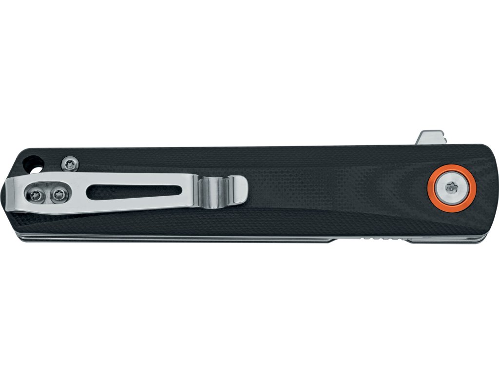 Ergonomická rukojeť z materiálu G10 v černém provedení nabízí jistý úchop a vysokou odolnost. Tento kompozit ze skelných vláken a pryskyřice se vyznačuje pevností, lehkostí a odolností vůči vlhkosti i mechanickému namáhání. Kvalitní zpracování doplňují detaily z nerezové oceli – distanční vložka, šrouby i kapesní klip v leštěném provedení.