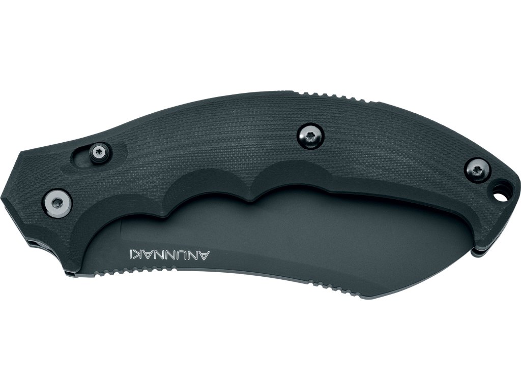Rukojeť je vyrobena z černého materiálu G10, který zajišťuje vysokou odolnost a pevný úchop i v náročných podmínkách. Protiskluzové drážkování na hřbetu čepele navíc zlepšuje ovladatelnost při přesné práci.