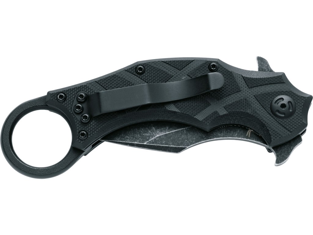 Rukojeť z černého G10 je ergonomicky tvarovaná a zajišťuje jistý úchop i v náročnějších podmínkách. Ocelový kapesní klip s černou PTFE úpravou umožňuje pohodlné a stabilní nošení v kapse nebo na výstroji. Robustní konstrukce a tvar karambitu činí z tohoto nože efektivní nástroj pro řezání, tahové pohyby i krizové situace, kde je nutné jednat rychle a přesně.