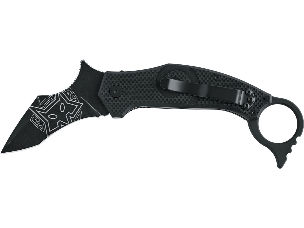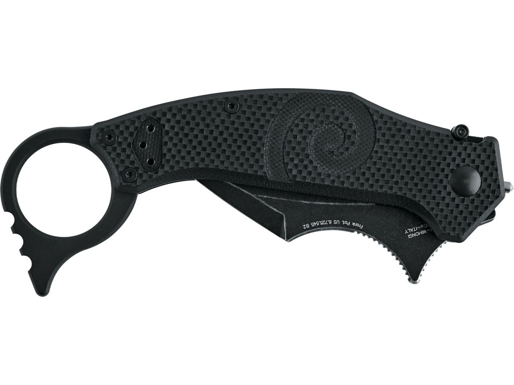 Karambit Moa je vybaven čepelí z prvotřídní nerezové oceli N690Co s odolnou černou povrchovou úpravou Idroglider stone washed. Jeho ergonomicky tvarovaná rukojeť z černého G10 zajišťuje bezpečný úchop i v náročných podmínkách. Na rukojeti najdete také typický spirálový motiv, který je poznávacím znakem této řady a symbolizuje rotaci a pohyb v boji.
