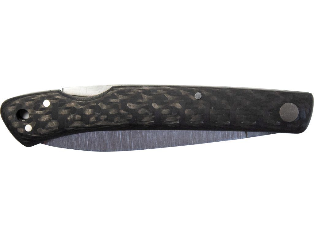 Rukojeť z uhlíkových vláken (carbon fiber) zajišťuje nejen nízkou hmotnost, ale také vysokou pevnost a moderní vzhled. Elegantní kontrast mezi saténovou čepelí a tmavou karbonovou rukojetí dělá z tohoto nože stylový doplněk.