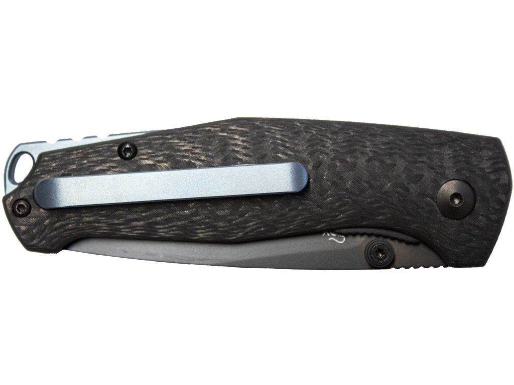 Rukojeť z uhlíkového vlákna s modře anodizovanými titanovými detaily je lehká, pevná a ergonomicky tvarovaná pro pohodlný úchop. Přenos je usnadněn díky modrému titanovému klipu pro tip-up nošení. Na konci rukojeti je otvor pro šňůrku.