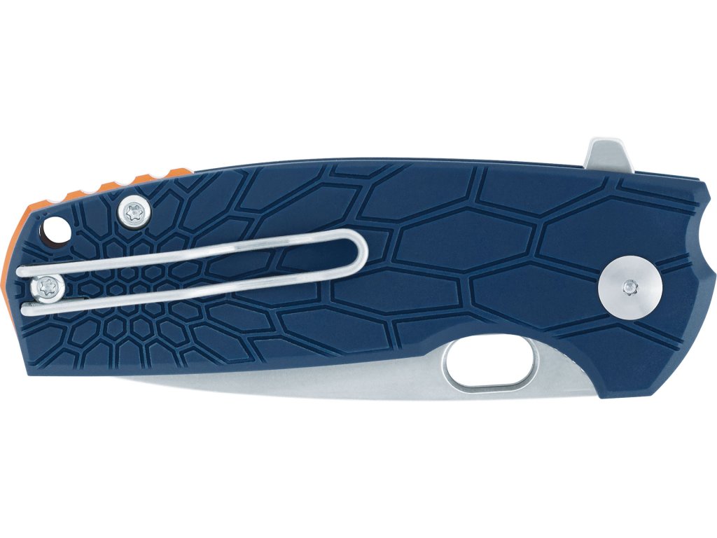 Rukojeť z lehkého a odolného materiálu FRN® (Fiber Reinforced Nylon) v atraktivní modré barvě je ergonomicky tvarovaná a příjemná do ruky. Oranžový anodizovaný hliníkový spacer dodává noži originální kontrastní detail. Pro pohodlné nošení slouží oboustranný kapesní klip z nerezové oceli AISI 420.