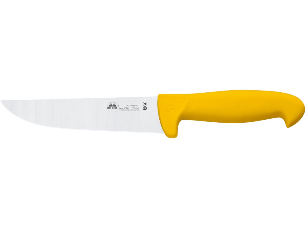 Řeznický nůž Due Cigni 2C 410/16 NG je robustní nástroj, navržený pro každodenní práci v profesionálních kuchyních, řeznictvích i domácnostech. Díky silné, pevné a masivní čepeli z nerezové oceli 4119 Nitro-B si snadno poradí s porcováním větších kusů masa, řezáním skrz chrupavky i tvrdší části surovin.