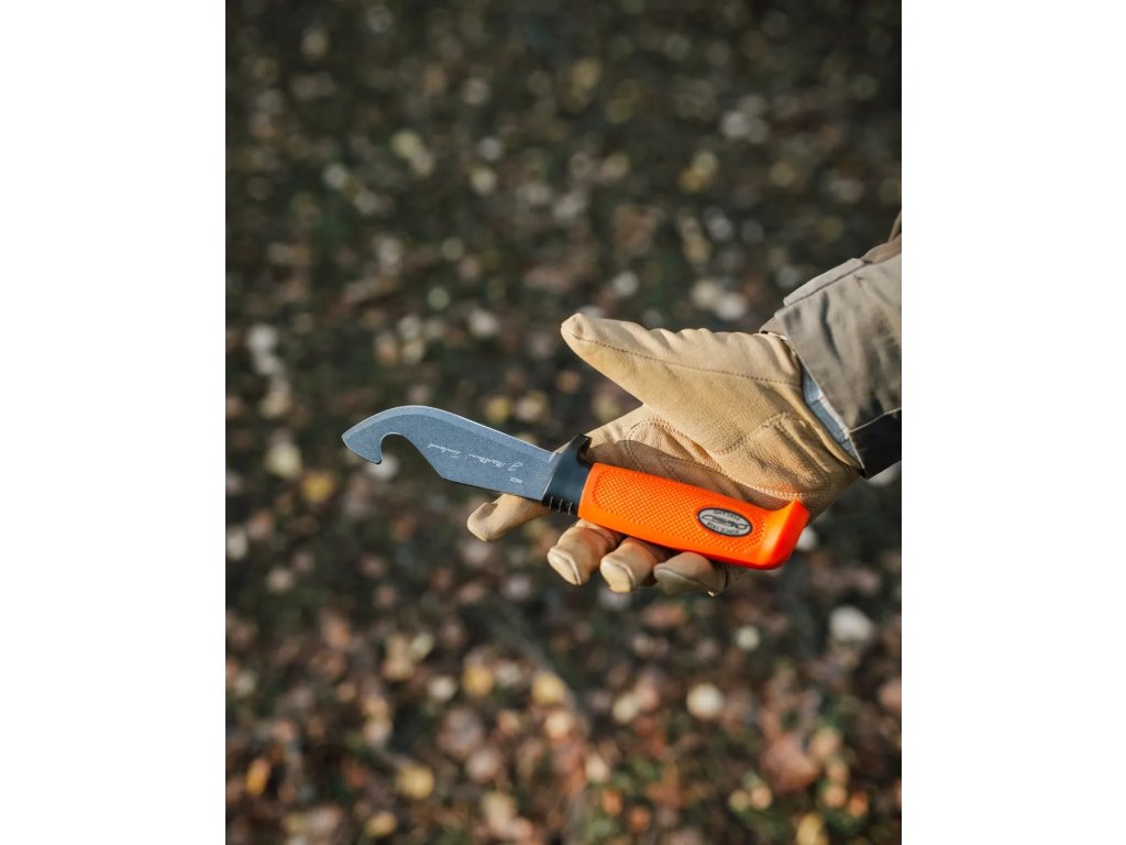 Integrovaný párák (skinning hook) na hřbetu čepele umožňuje bezpečné