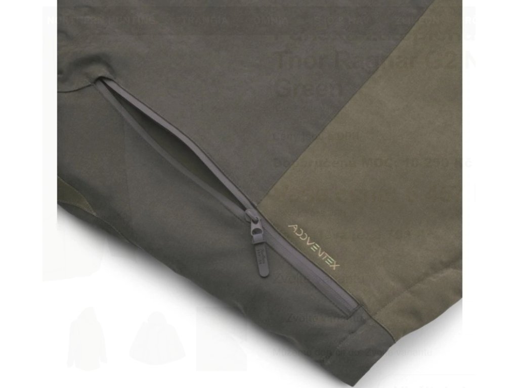 Základem je ekologická membrána ADDVENTEX™ ECO 10.12, která kombinuje vodní sloupec 10 000 mm a prodyšnost 12 000 g/m²/24 h. Materiál je plně voděodolný, větruodolný a tichý, takže tě ochrání před nepřízní počasí, aniž by prozradil tvůj pohyb v lese. Díky vysoké odolnosti bunda zvládne i náročné používání v terénu.