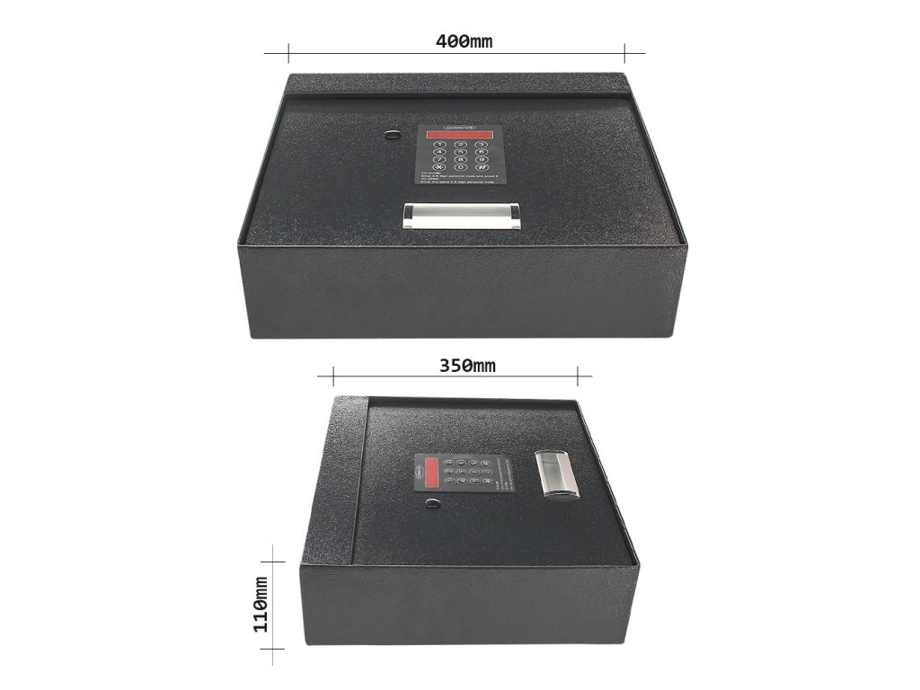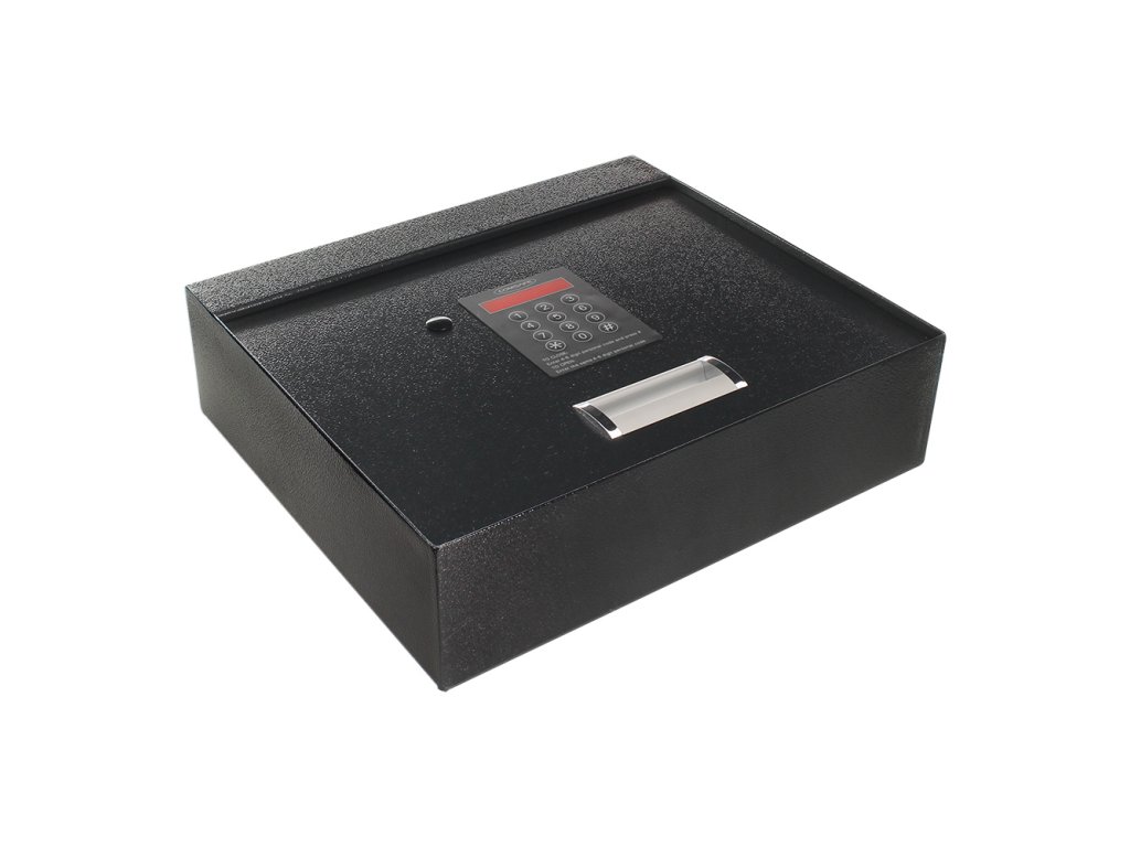 Hlavní výhody: Elektronický zámek s 2 klíči Možnost úschovy i zbraní a munice podle č. 190/2003 Sb. z. Napájení 4 x 1,5V AA bateriemi (nejsou součástí balení) Jednoplášťový sejf Korpus tloušťky 1,5 mm a dveře tloušťky 4 mm Mechanické nouzové otevírání s cylindrickým zámkem a 2 klíči Otvory na ukotvení na spodní straně sejfu Antracitový sejf nabízí netradiční tvar, kdy je klávesnice pro zadávání kódu umístěna na horním víku sejfu. Po zadání kódu stačí zvednout horní víko sejfu a máte okamžitě přístup k uloženým věcem. Sejf má elektronický zámek spolu s mechanickým nouzovým otevíráním. Napájení zámku je řešeno prostřednictvím klasických 1,5V AA baterii. Jednoplášťové provedení sejfu má na spodní straně připraveno otvory pro ukotvení. Kotvící materiál je součástí balení.Doplňkové parametry