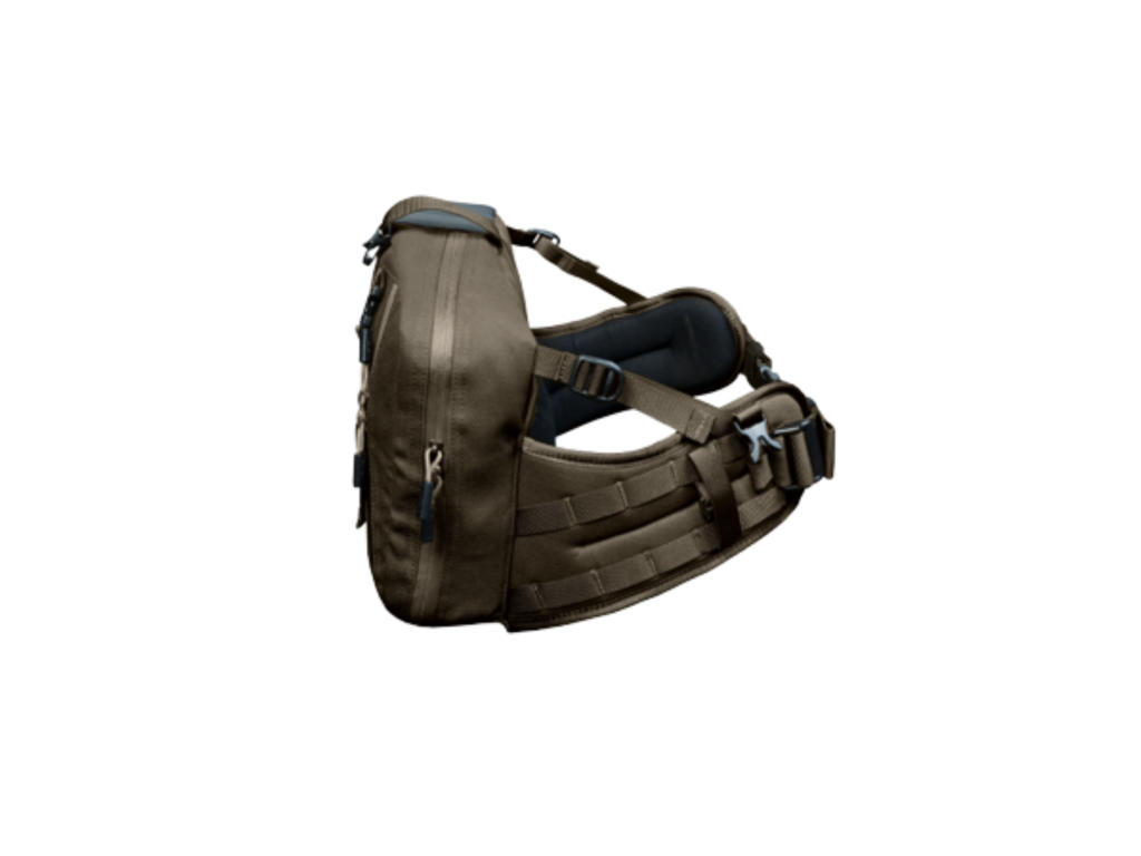 Hip pack je vyroben z třívrstvé tkaniny V-Tex, která je voděodolná, tichá a odolná vůči opotřebení. Robustní bederní pás s MOLLE vazbou umožňuje připevnění dalšího vybavení a zároveň zajišťuje stabilní usazení na těle. Praktickým prvkem jsou také poutka umožňující snadné otočení batohu kolem pasu pro rychlý přístup k obsahu.